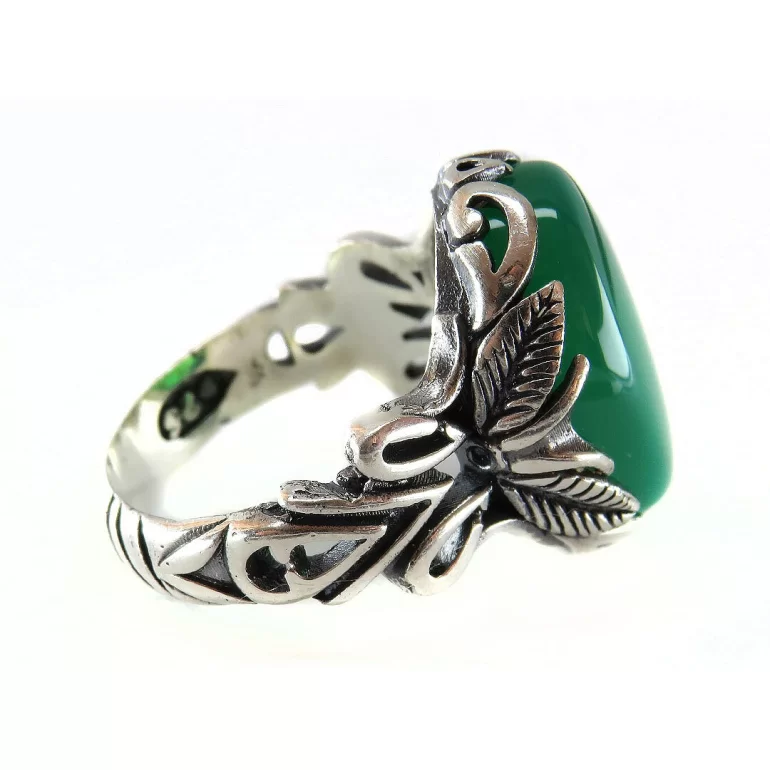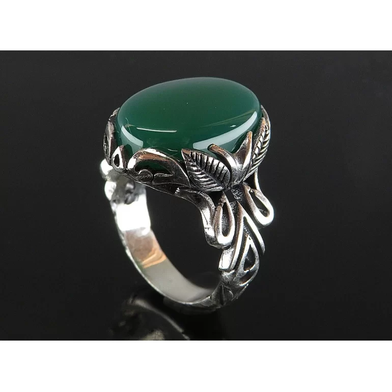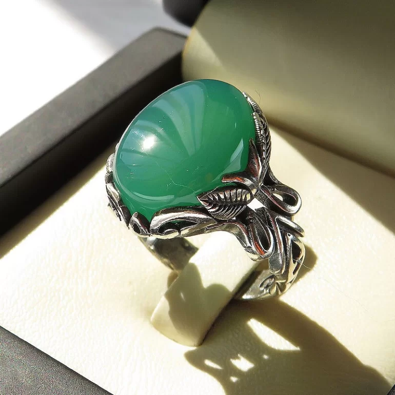 رکاب این انگشتر مردانه از نقره 925 عیار بوده و نگین آن از جنس عقیق سبز می باشد. وزن این انگشتر نفیس تقریبا 12 گرم است و به صورت حرفه ای به دست استادکار خبره و باتجربه ساخته می شود. رکاب انگشتر دارای طراحی برگ جاستین می باشد.