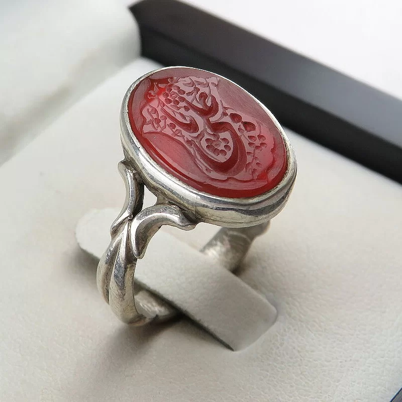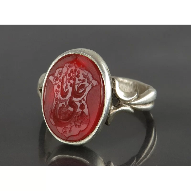 رکاب این انگشتر مردانه از نقره 925 عیار بوده و نگین آن از جنس عقیق قرمز دست ساز می باشد. وزن این انگشتر نفیس تقریبا 7 گرم است و به صورت حرفه ای به دست استادکار خبره و باتجربه ساخته می شود. و دارای حکاکی یا علی می باشد.
