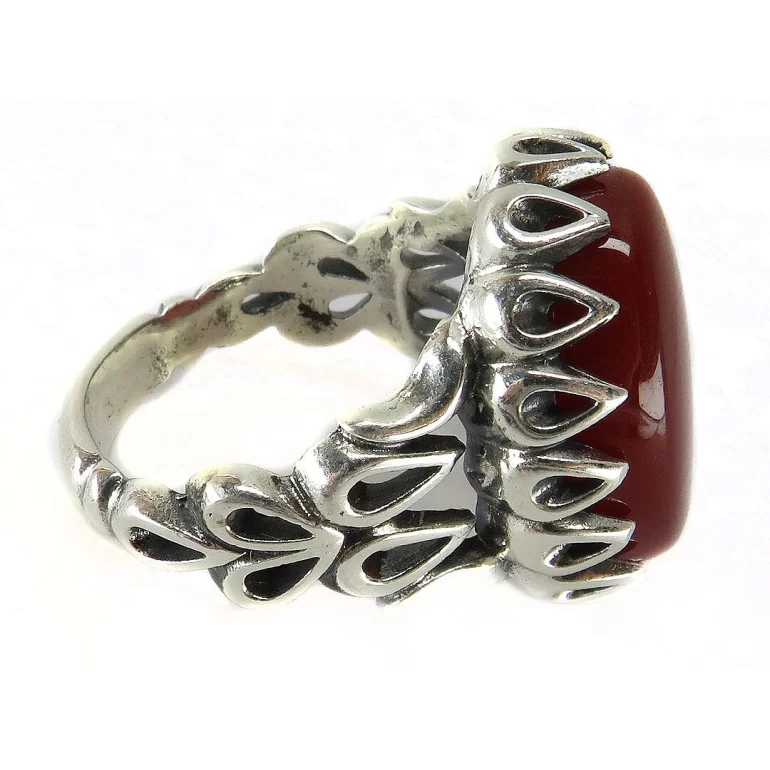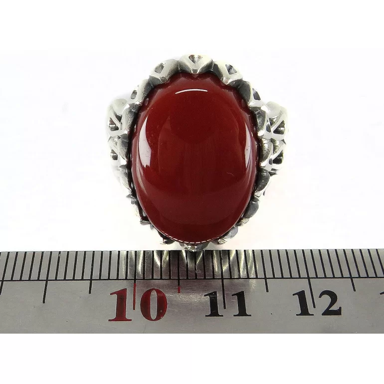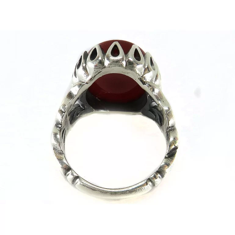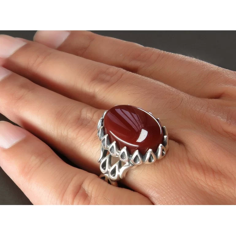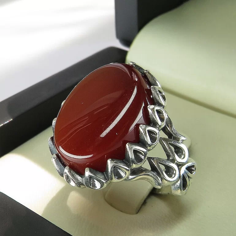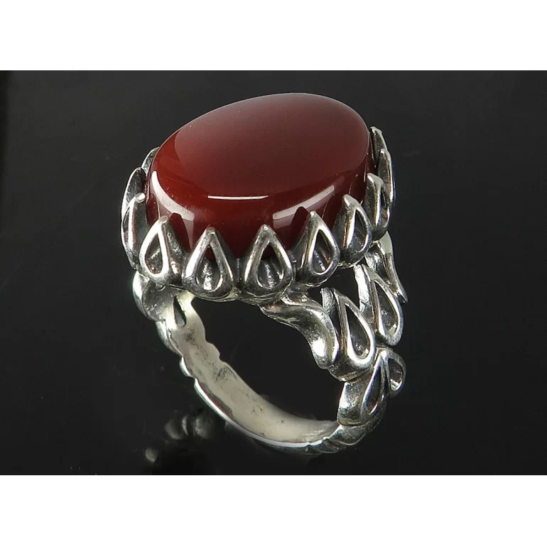 رکاب این انگشتر مردانه از نقره 925 عیار بوده و نگین آن از جنس عقیق قهوه ای می باشد. وزن این انگشتر نفیس تقریبا 13 گرم است و به صورت حرفه ای به دست استادکار خبره و باتجربه ساخته می شود.