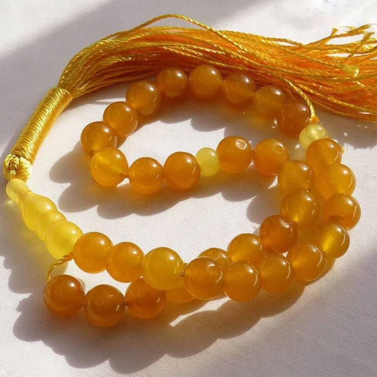 تسبیح جید زرد 33 دانه حکاکی شرف الشمس کد 114298