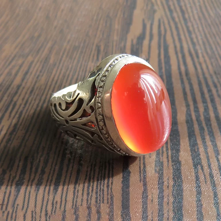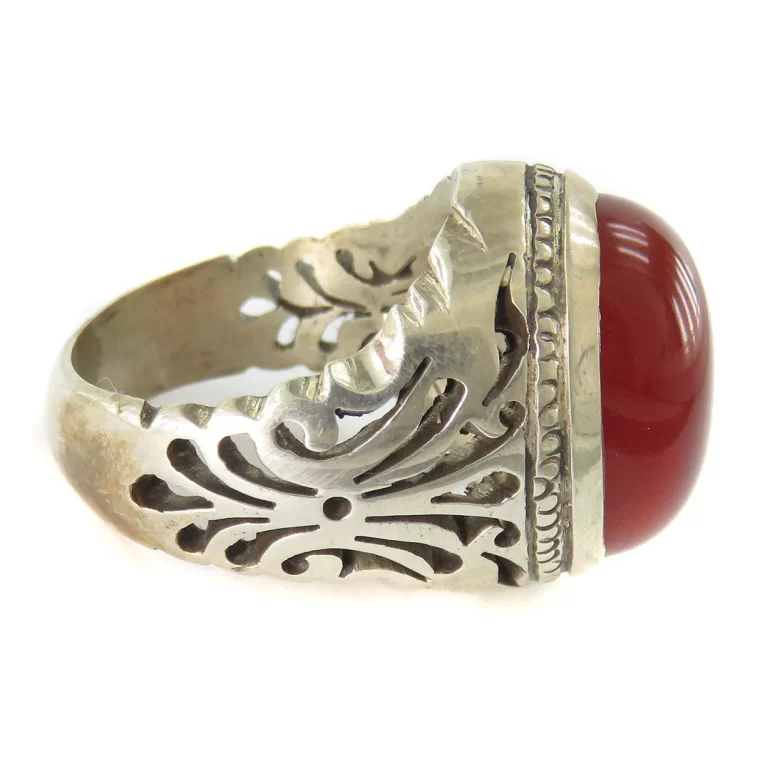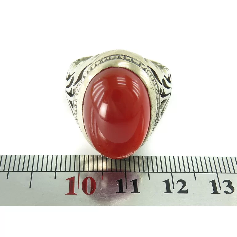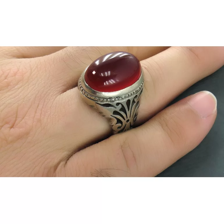 رکاب این انگشتر مردانه از نقره 925 عیار بوده و نگین آن از جنس عقیق خراسان قرمز دست ساز می باشد. وزن این انگشتر نفیس تقریبا 21 گرم است و به صورت حرفه ای به دست استادکار خبره و باتجربه ساخته می شود.