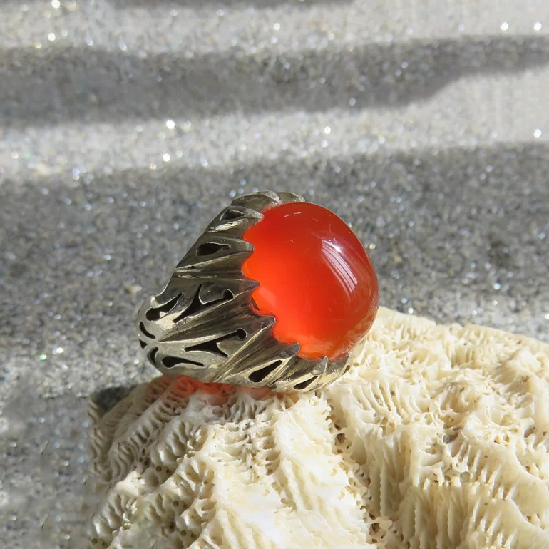 رکاب این انگشتر مردانه از نقره 925 عیار بوده و نگین آن از جنس عقیق خراسان قرمز دور چنگ دست ساز رنگ تقویت شده می باشد. وزن این انگشتر نفیس تقریبا 17 گرم است و به صورت حرفه ای به دست استادکار خبره و باتجربه ساخته می شود.
