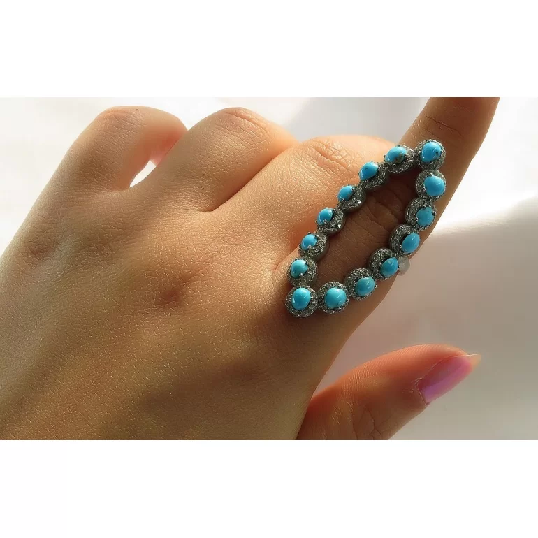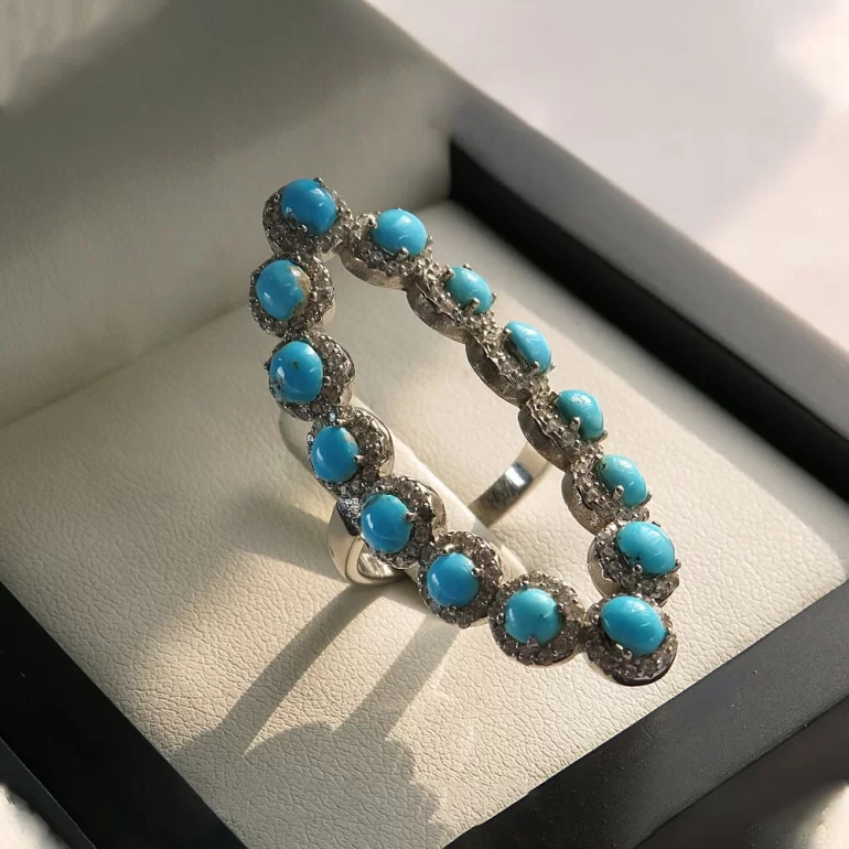 انگشتر زنانه فیروزه نیشابوری عجمی فاخر جذاب، رکاب این انگشتر از نقره 925 عیار با وزن تقریبا 10 گرم است. سفارشات هر انگشتر بلافاصله به دست اساتید خبره و زبردست در زمان کوتاهی، درست مطابق سایزی که شما ثبت می‌کنید ساخته شده و آماده ارسال می‌شوند. بدنه این انگشترها دارای ضخامت و کیفیت بالایی می‌باشند، به طوری که ترکیب نقره های اصیل با سنگ نگینشان، زیبایی خیره کننده‌ای را خواهند ساخت. محصولات انگشتر ربیع از قبل آماده نشده اند و همه آنها مطابق با سایز دست شما که از طریق منو انتخاب می‌کنید، ساخته خواهند شد.