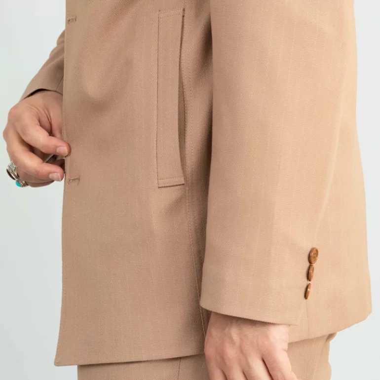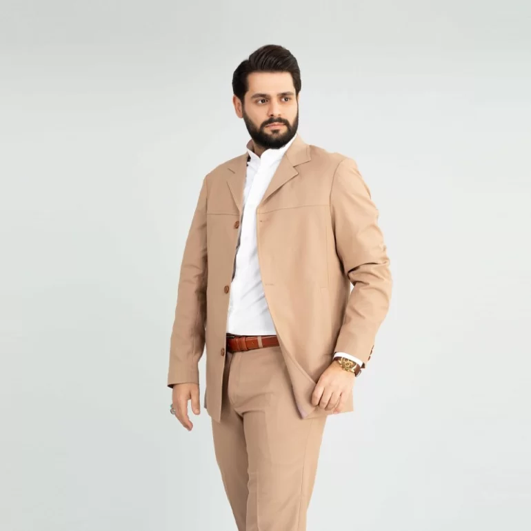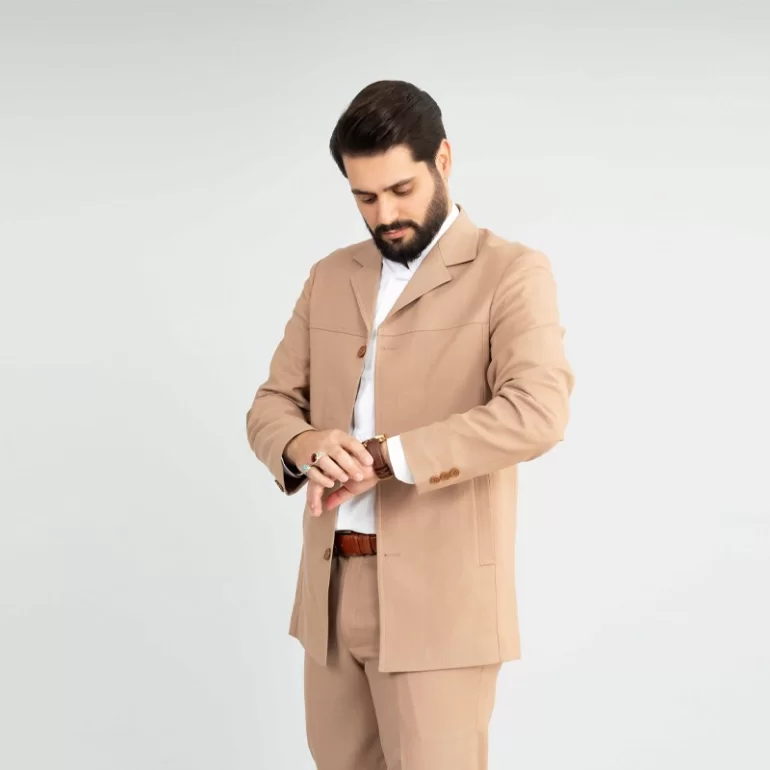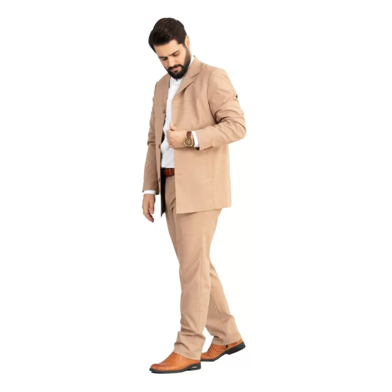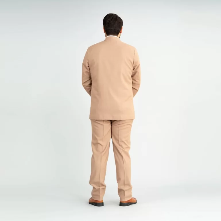 کت و شلوار سافاری رنگ کرمی، یقه این کت و شلوار از نوع یقه خشتی بوده و به صورت تک چاک و دراپ 6 است. همچنین این کت و شلوار دارای قواره کلاسیک می باشد.