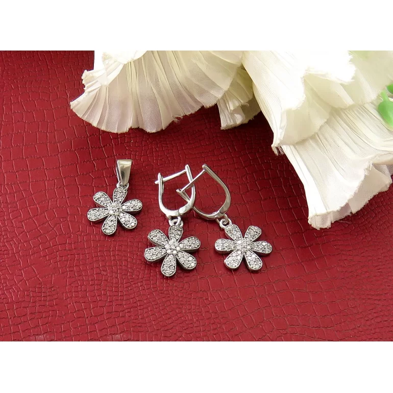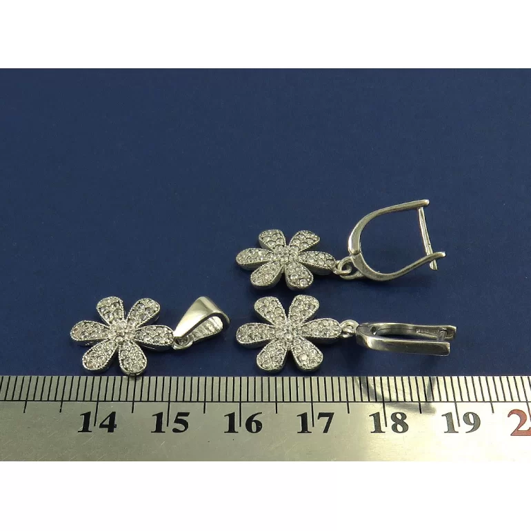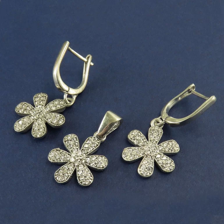 سرویس زنانه طرح غزل، این محصول از فریم نقره 925 عیار ساخته شده که با وزن حدود 8 گرم است. این محصول شامل یک جفت گوشواره و یک عدد گردنبند می باشد.