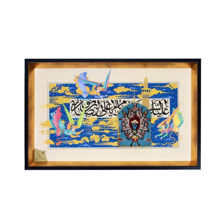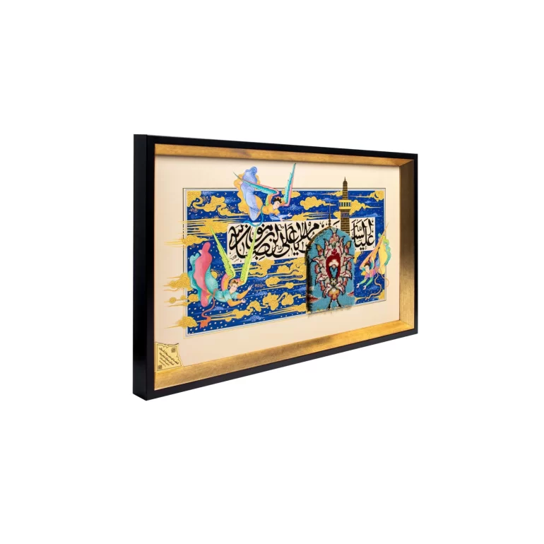 انتخاب یک دکور خوب به خونه روح دیگری میبخشد. همچنین نمایانگر سلیقه و نوع اندیشه و عقیده ما نیز هست. قابهای روی دیوار جزئی از دکور خانه محسوب میشوند و با انتخاب قاب فرش فرشته میتوانیم حسوحال حرم امام رضا(ع) را در طرحی متفاوت به خانههایمان بیاوریم طرحی که در آن هنر ایرانی توانسته نقشی از فرشتههای مقیم آستان را در کنار یک خطاطی زیبا و قطعهای از فرش حرم در میان قابی چوبی بهزیبایی بنشاند.طرح های طلاکوبی شده توانسته روح تازه ای به قاب ببخشد. این قاب با نگارگری استاد اسد فقیهی و خطاطی استاد ناصر طاووسی شکل گرفته است. همچنین فرش استفاده شده در این قاب از فرشهای ماشینی حرم امام رضا(ع) میباشد.