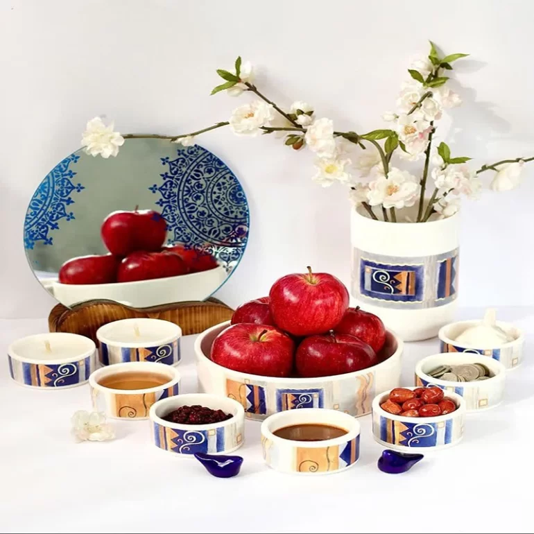 ظروف هفت سین سرامیکی آبی به تعداد محدود، برای تزئین سفره های سال نو شمسی برای علاقه مندان فراهم شده است این ست شامل ده تکه و قیمت بدون گلدان محاسبه شده است.