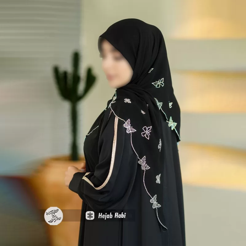 این روسری مشکی نگین دار ، از پارچه کرپ حریر درجه یک رنگ مشکی و با عرض حدود 110 سانتی‌متر تولید شده است. این نوع پارچه مجلسی بسیار سبک و لطیف بوده، چروک نمی‌شود و از روی سر لیز نمی‌خورد. رنگ سنگ روی حاشیه روسری از سنگ هفت رنگ کار شده است و زیبایی خاصی به آن بخشیده است.