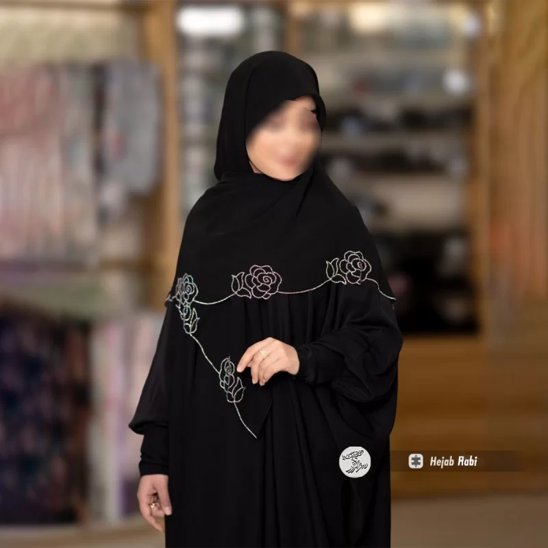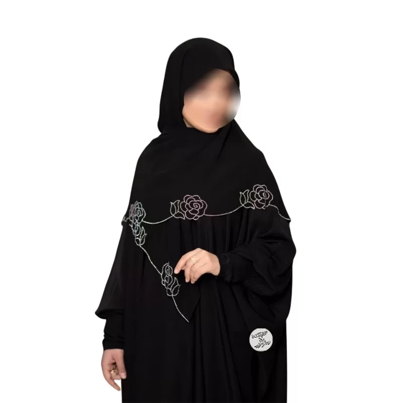 روسری مشکی نگین دار طرح زرین، از پارچه کرپ حریر درجه یک با رنگ مشکی تولید شده است. این نوع پارچه مجلسی بسیار سبک و لطیف بوده، چروک نمی‌شود و از روی سر لیز نمی‌خورد. روی حاشیه روسری با نگین های بسیار جذاب کار شده است.