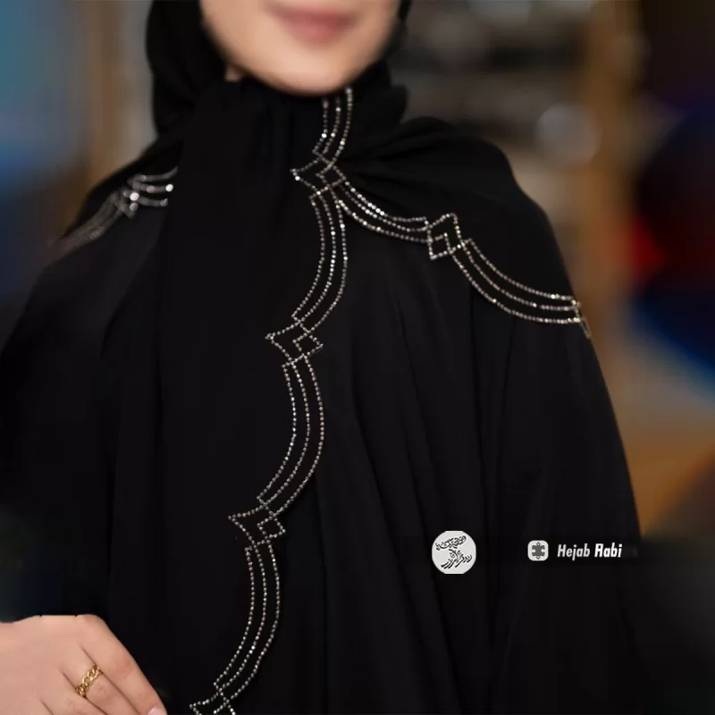 روسری مشکی نگین دار طرح زرین، از پارچه کرپ حریر درجه یک رنگ مشکی  تولید شده است. این نوع پارچه مجلسی بسیار سبک و لطیف بوده، چروک نمی‌شود و از روی سر لیز نمی‌خورد. روی حاشیه روسری با نگین های بسیار جذاب کار شده است.