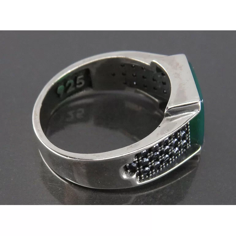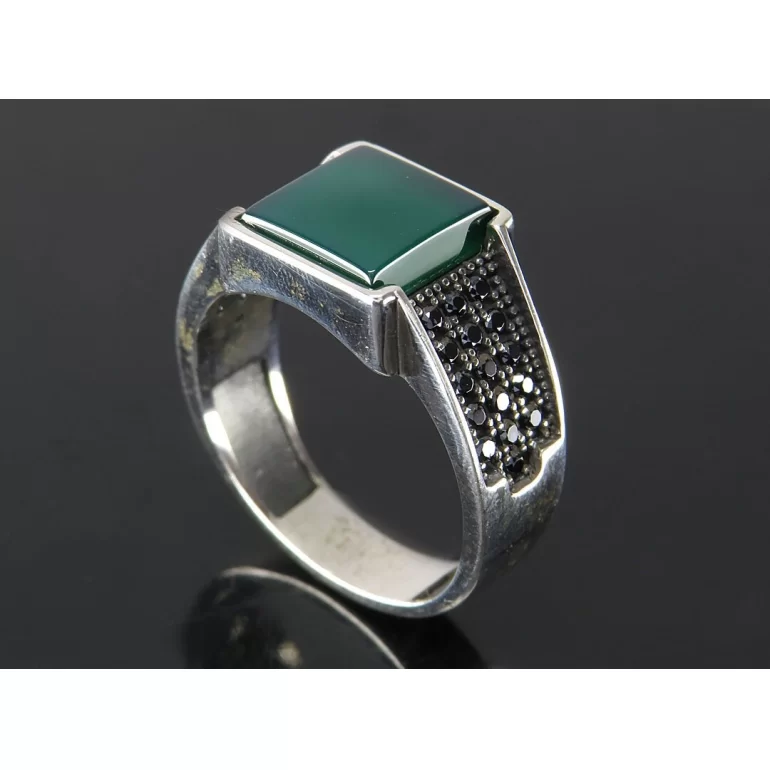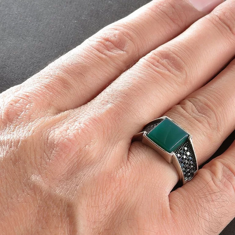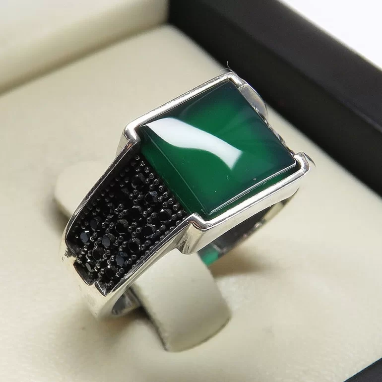 رکاب این انگشتر مردانه از نقره 925 عیار بوده و نگین آن از جنس عقیق سبز می باشد. وزن این انگشتر نفیس تقریبا 7.5 گرم است و به صورت حرفه ای به دست استادکار خبره و باتجربه ساخته می شود.