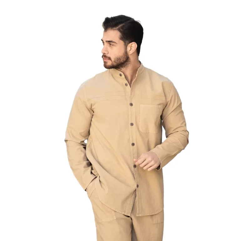 پیراهن الیافی مردانه مدل تمام دکمه رنگ نخودی کد 858