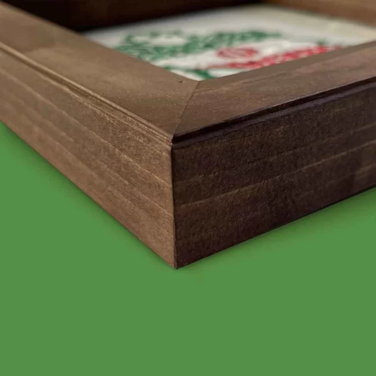 این قاب مذهبی با ابعاد 21*21 سانتی متر و از جنس چوب روسی با زمینه پارچه ترگال سفید تولید شده است. همچنین برای طرح این قاب از تکنیک گلدوزی ماشینی استفاده شده است.