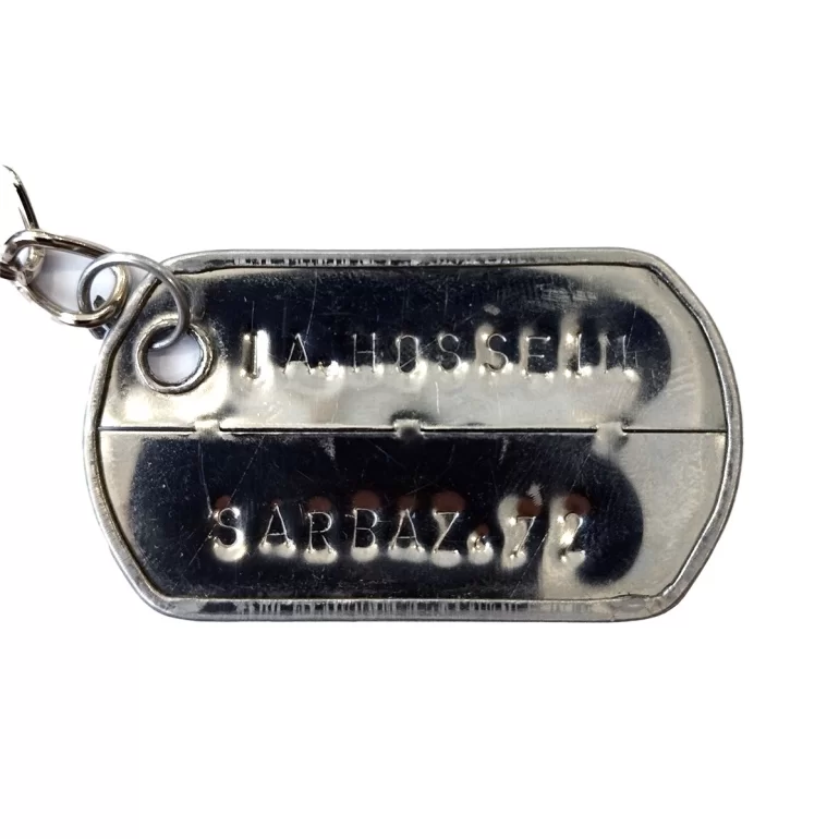 این جاکلیدی فلزی یک پلاک هویت دو تکه سربازی است که در خط بالای آن عبارت «YA HOSSEIN» و در خط پایین آن عبارت «SARBAZ 72» ضرب شده است. ابعاد تقریبی پلاک 3×5 سانتی متر بوده و از یراق آلات با کیفیت در ساخت آن استفاده شده است.