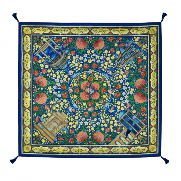 جنس این سفره پارچهٔ هازان است و از چاپ سابلیمیشن می باشد که در ابعاد 100*100 سانتیمتر تولید شده است. در حاشیه این سفره ابیاتی از چهار شاعر بزرگ مانند حافظ، سعدی، فردوسی و خیام به خطی خوش قلم خورده است و تصویر آرامگاه آنها نیز در میان دشتی از گلستان پرگل طراحی شده است.