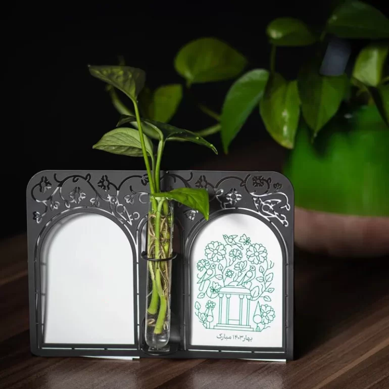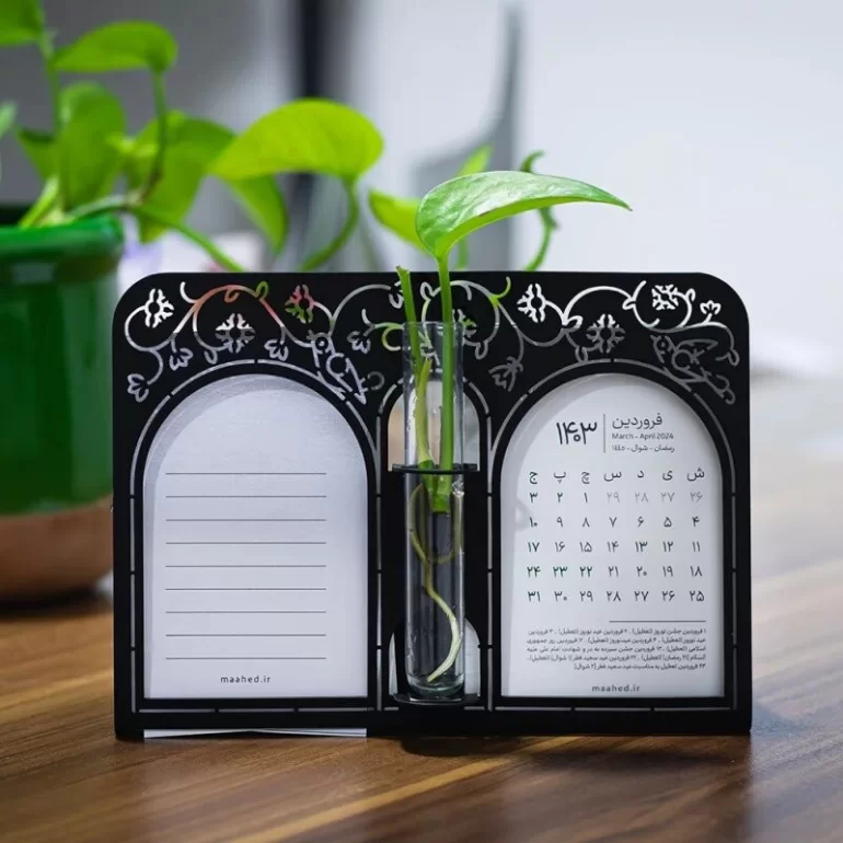 تقویم سال 1403 خورشیدی از جنس فلز با ابعاد 7×12×17 سانتی متر تولید شده است. این محصول از سه بخش تقویم، محل نگهداری کاغذهای یادداشت و یک گلدان شیشهای کوچک تشکیل شده است که برای استفاده روی میزکار، خانه و هدیه دادن مناسب می باشد.