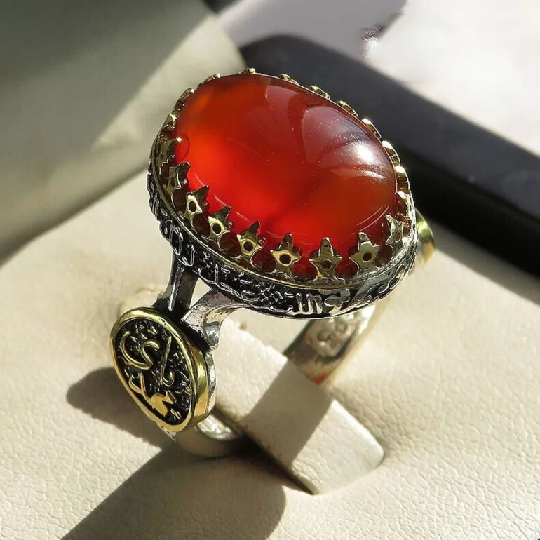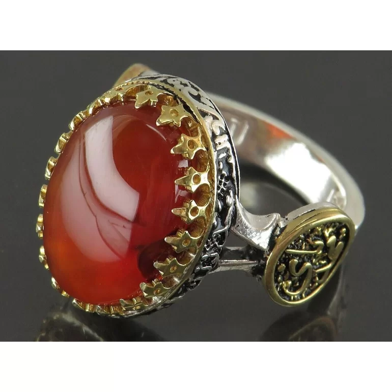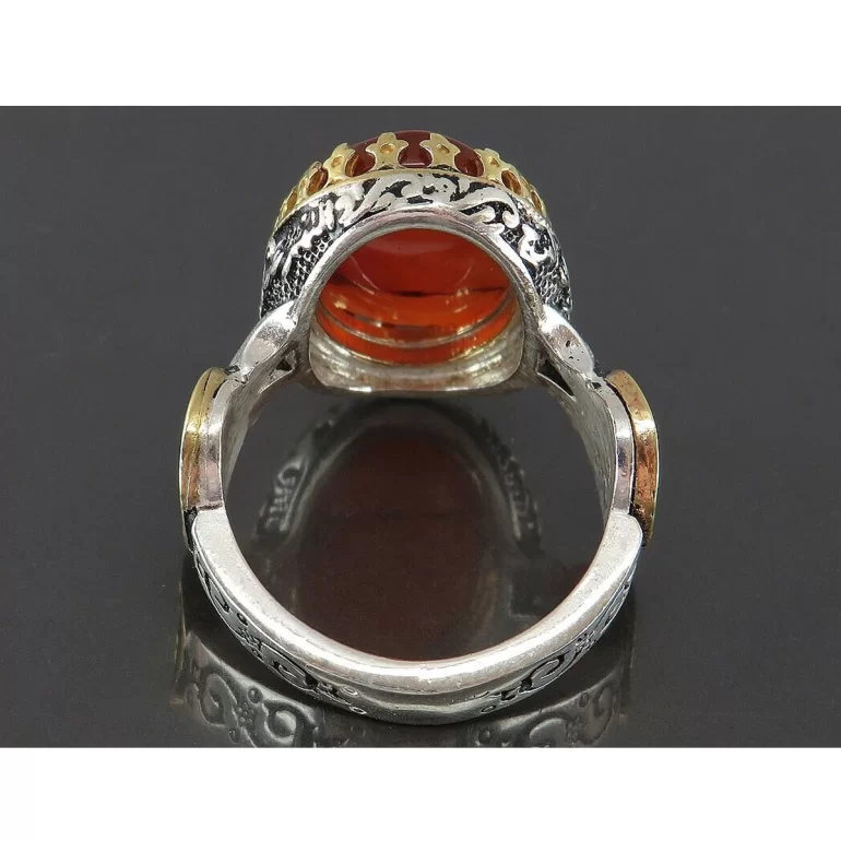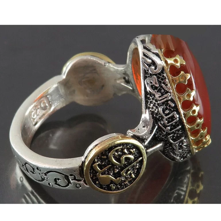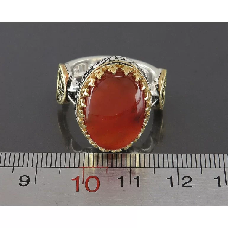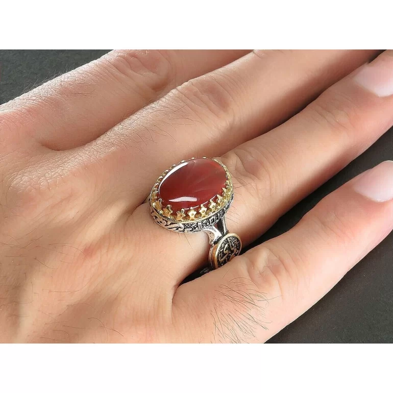 رکاب این انگشتر مردانه از نقره 925 عیار بوده و نگین آن از جنس عقیق یمنی می باشد. وزن این انگشتر نفیس تقریبا 11.5 گرم است و به صورت حرفه ای به دست استادکار خبره و باتجربه ساخته می شود.