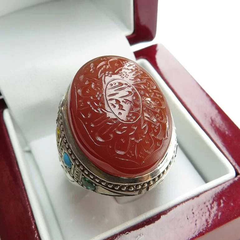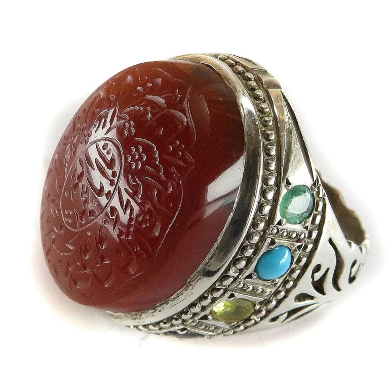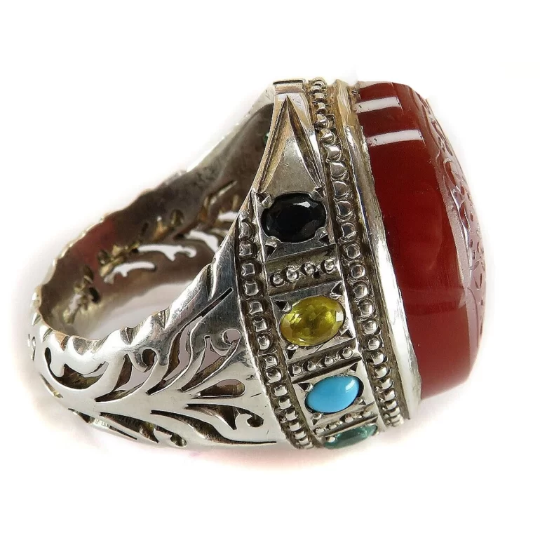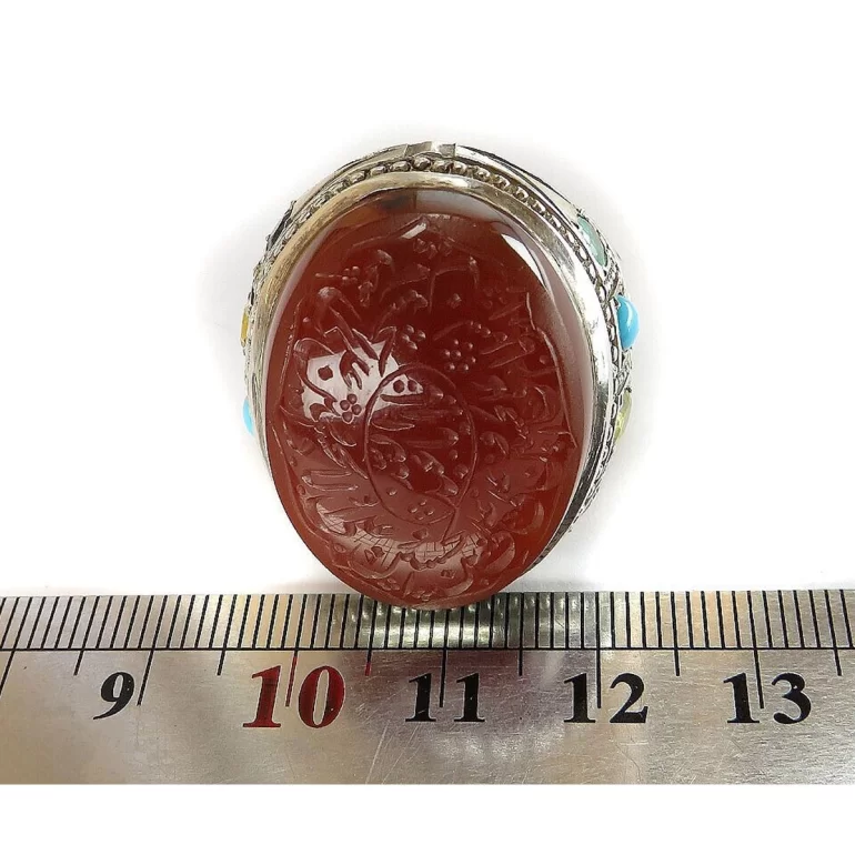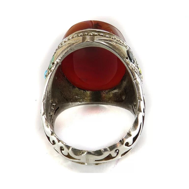 رکاب این انگشتر مردانه از نقره 925 عیار بوده و نگین آن از جنس عقیق یمنی می باشد. وزن این انگشتر نفیس تقریبا 29 گرم است و به صورت حرفه ای به دست استادکار خبره و باتجربه ساخته می شود و دارای مخرج کاری یاقوت فیروزه دست ساز است.