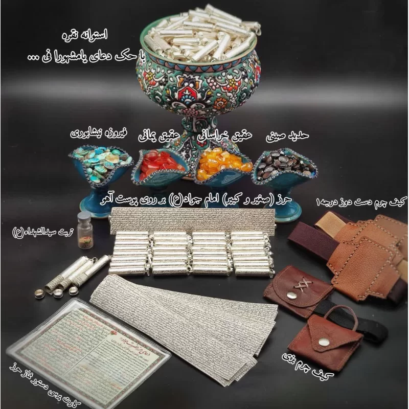 که با رعایت کامل آداب و طبق سفارشات ائمه، آنچه که در متن روایت آمده است؛ بر روی یک عدد پوست آهو نگاشته میشوند. سپس، این پوست آهو به همراه تربت کربلا درون یک استوانه نقره قرار میگیرد و بر روی استوانه، دعای مخصوص (یامشهورا فی السماوات...) طبق دستور متن روایت، حکاکی میشود. این پک به همراه یک عدد کیف چرم دستدوز درجه1 به صورت بازوبندی ارائه میشود.