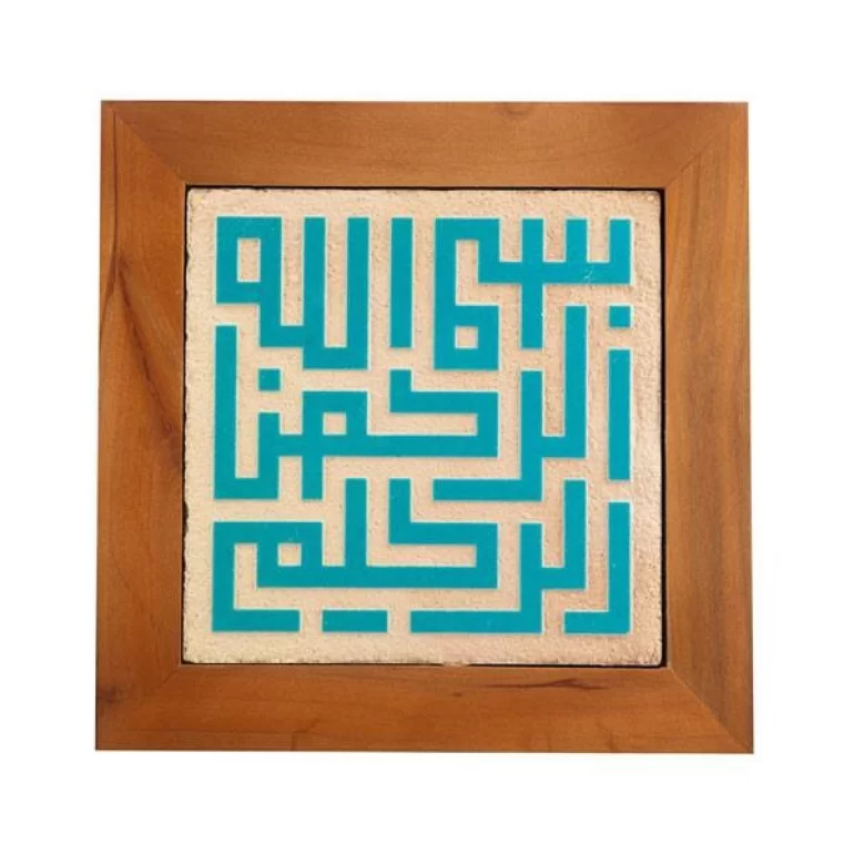 تابلو کاشی لعابدار طرح بسم الله الرحمن الرحیم تابلویی 1 تکه به ابعاد 20×20 سانتی متر از مجموعه تابلوهای جلی است. این اثر زیبا و هنرمندانه دارای قاب چوبی بوده، زمینه آن کاشی با رنگ آجری می باشد و عبارت روی تابلو با کاشی لعابدار فیروزه ای رنگ نگارش شده است.