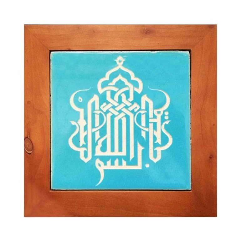 تابلو کاشی لعابدار طرح بسم الله الرحمن الرحیم تابلویی 1 تکه به ابعاد 20×20 سانتی متر از مجموعه تابلوهای جلی است. این اثر زیبا و هنرمندانه دارای قاب چوبی بوده، زمینه آن کاشی با رنگ فیروزه ای می باشد و عبارت روی تابلو با کاشی لعابدار سفید رنگ نگارش شده است.