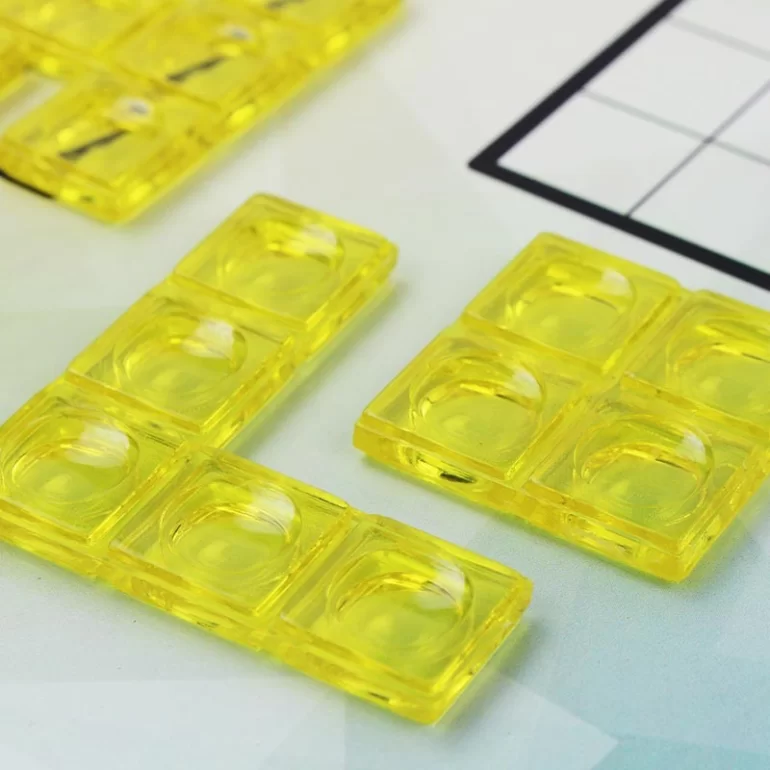 - قطعات پلاستیکی با اشکال متنوع (پلییومینو): این بازی شامل تعدادی قطعهی پلاستیکی رنگی با اشکال مختلف هندسیه که به اونها پلییومینو گفته میشه. این قطعات میتونن شامل اشکالی مثل دومینو (دو مربع متصل)، تریومینو (سه مربع متصل) و غیره باشن. تنوع اشکال، چالشهای مختلفی رو برای چیدمان و حل پازل ایجاد میکنه.