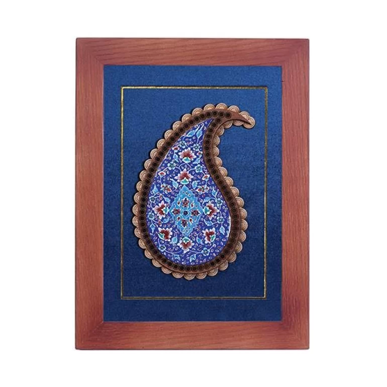 تابلو بته جقه طرح ساده با الهام از طرح ها و نقش و نگار های اسلیمی و ایرانی تولید شده و با روکش و شیشه و پارچه جیز مزین شده است. این تابلو هدیه ایست مناسب برای علامندان آثار صنایع دستی و هنر های اسلیمی و ابعاد آن 37×28×3 سانتی متر می باشد.