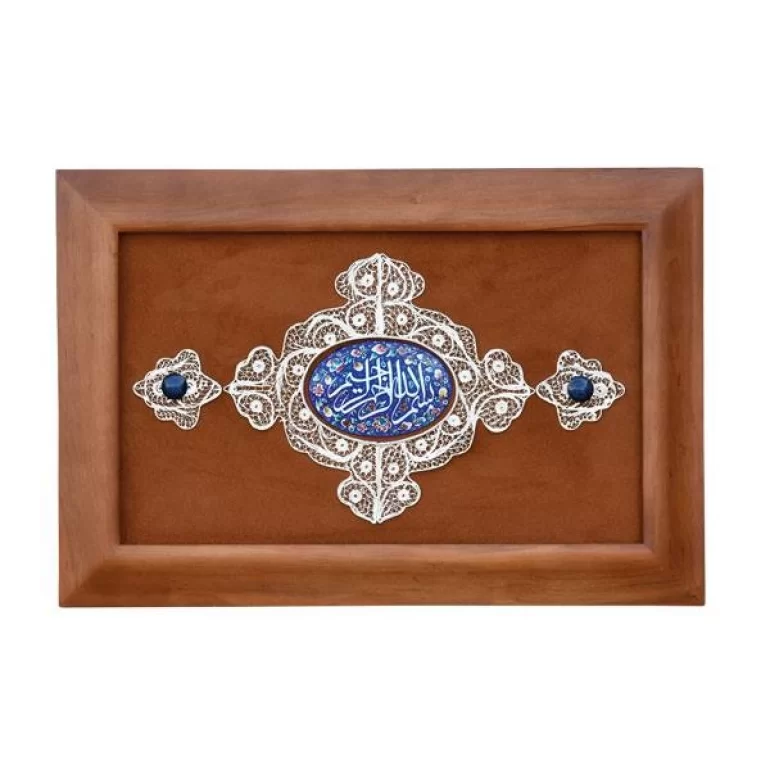 تابلو ماهوت ترنج طرح بسم الله یک هدیه ی رسمی و مناسب برای علامندان آثار سنتی و صنایع دستی فاخر می باشد. این تابلو که ترکیبی است از هنر مینا و شبکه بری چوب، بر اساس گره چینی ایرانی انجام شده است و پارچه ماهوت تزیین شده است.