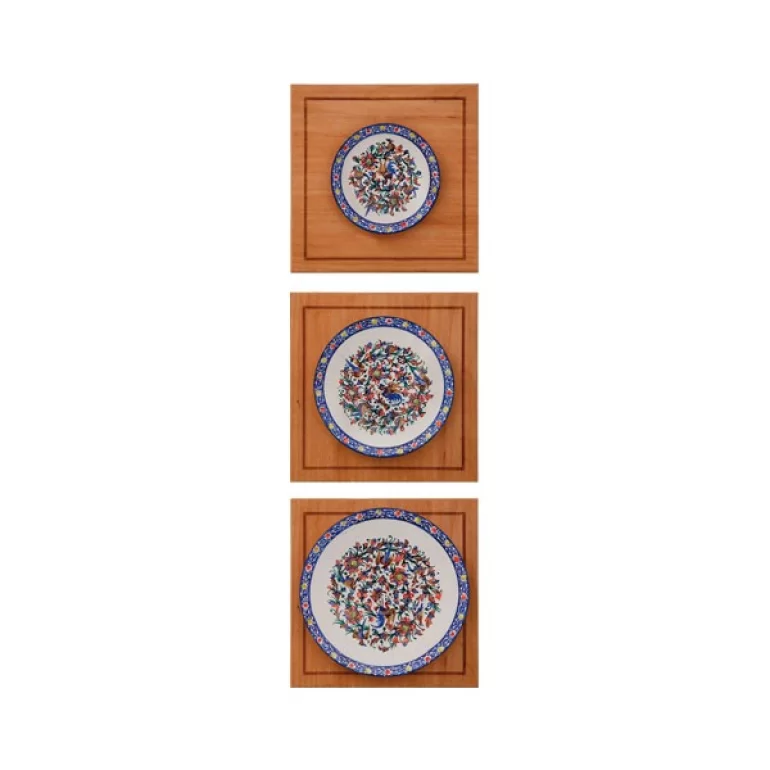 تابلو بشقاب سه تایی طرح گل و مرغ آبی ، دارای سه بشقاب می باشد که با هنر میناکاری بر روی ظروف مسی و لعاب دار ساخته شده و بر روی قابی از جنس چوب توسکا و قهوه ای رنگ نصب گردیده اند.این تابلو از جمله اثار مورد رضایت و مورد پسند مخاطبین در بازار صنایع دستی بوده است.