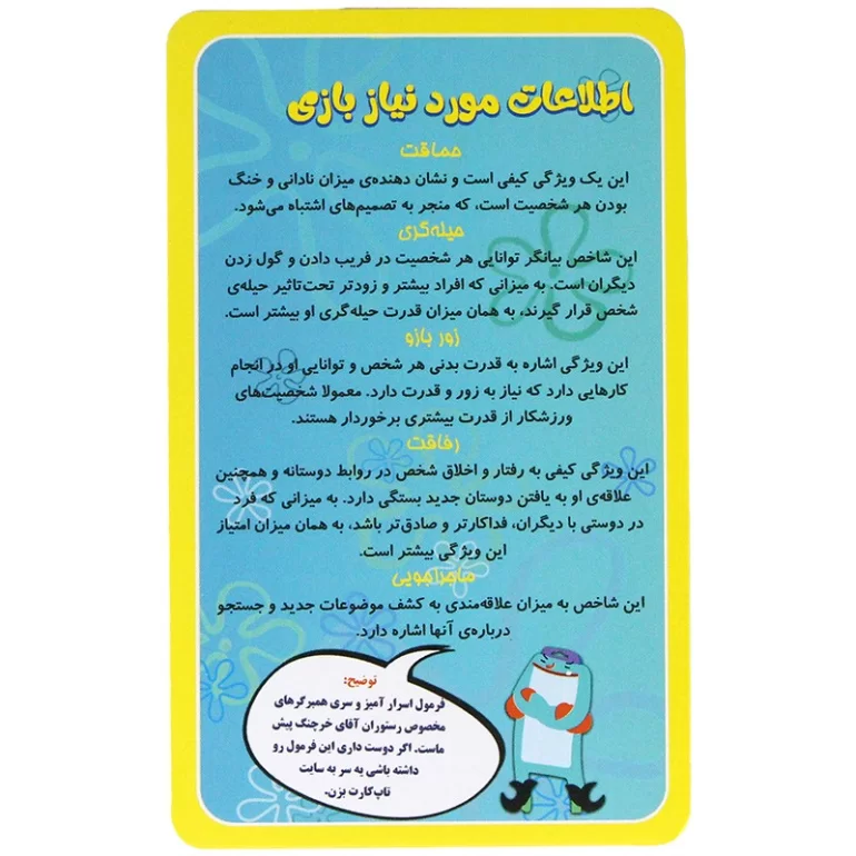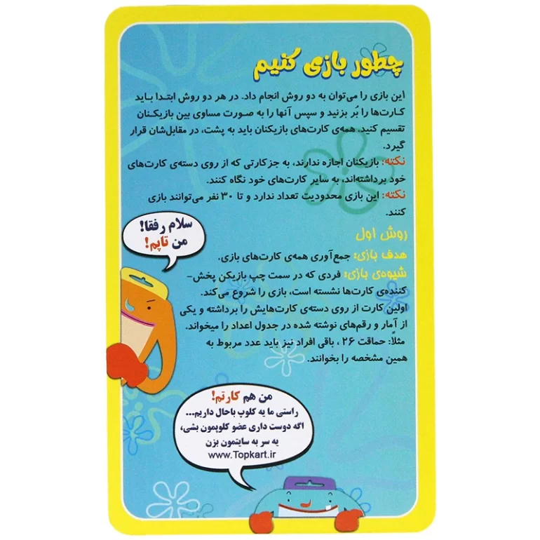 • کیفیت ساخت بالا: کارت‌های بازی از جنس مقوا با کیفیت ساخته شده‌اند و دوام بالایی دارند.