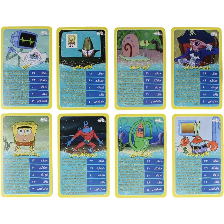 • کارت‌های جذاب با طرح شخصیت‌های باب اسفنجی: هر کارت حاوی اطلاعات جالب و سرگرم‌کننده‌ای در مورد یکی از شخصیت‌های محبوب کارتون باب اسفنجی است.