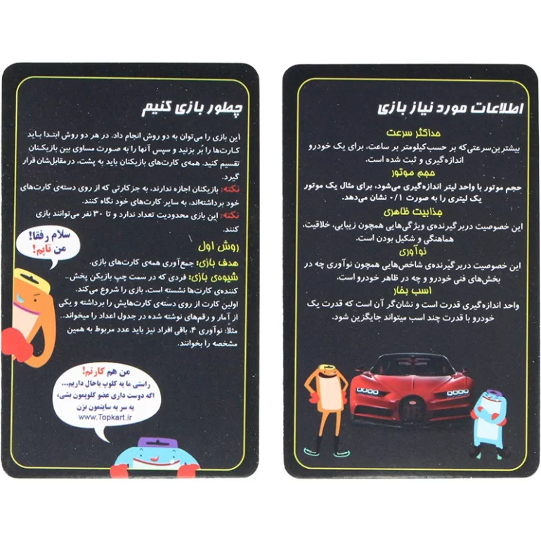• اطلاعات آموزنده: هر کارت شامل اطلاعاتی در مورد خودرو مربوطه، مانند مدل، برند، قدرت موتور، سرعت و ویژگی‌های خاص آن خودرو است.