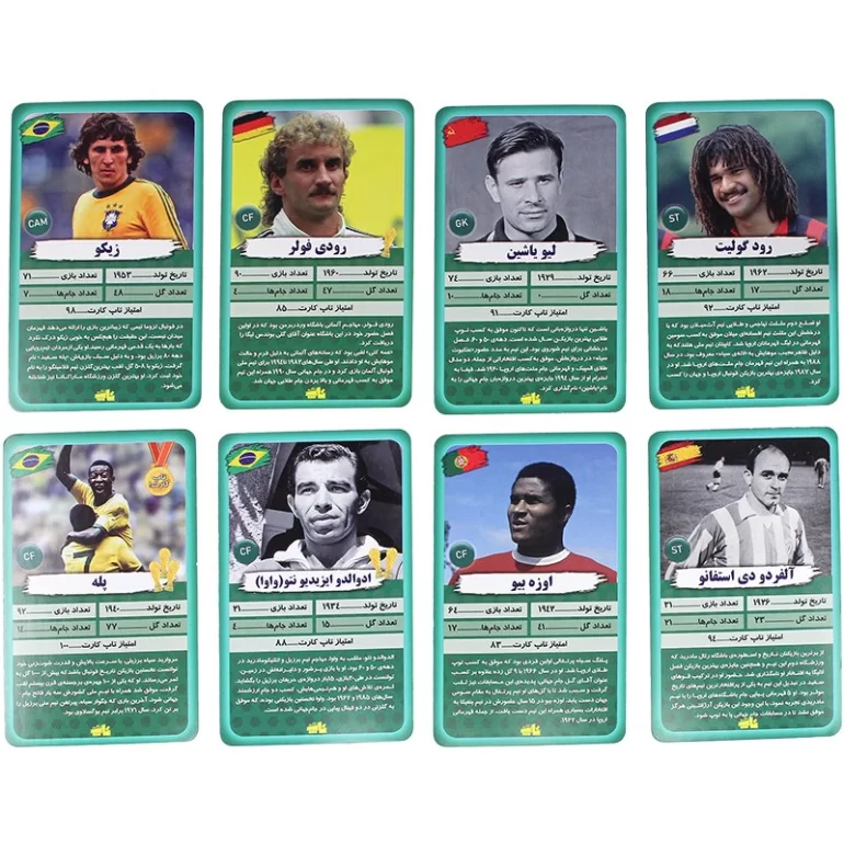 - طراحی جذاب: کارتها با طراحی زیبا و رنگارنگ از ستارههای بزرگ فوتبال در طول تاریخ تزئین شدهاند.