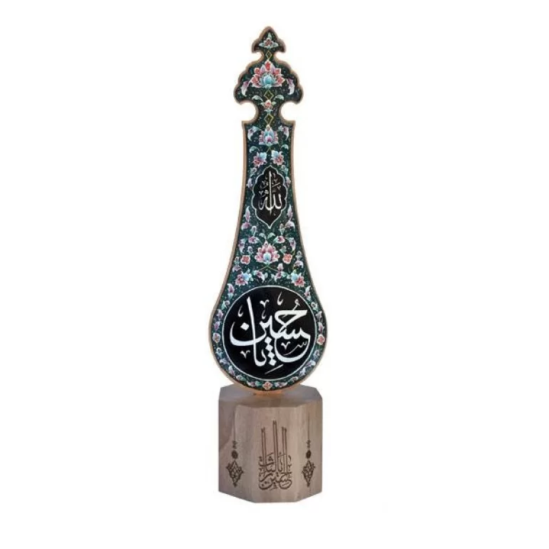تندیس علم مجموعه چوب و مینا با طرح یا حسین چشمی تندیسی زیبا برای هدیه دادن و مناسبت ها و هیئات بوده که با الهام از نقش های اسلیمی و ایرانی ساخته شده و دارای پایه ای دست ساز از جنس چوب توسکا بوده که با هنر سوخت چوب مزین شده است