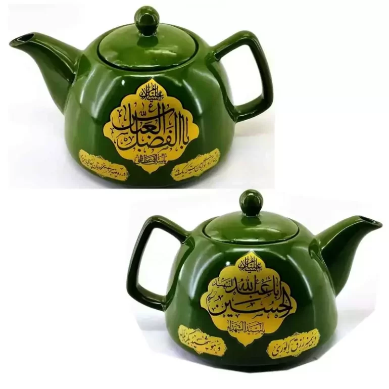 این قوری مذهبی از جنس چینی درجه یک با حجم یک لیتر و اندازه کف قوری 14 سانتیمتر تولید شده است و در دو طرف آن ذکرهای (یا اباعبدالله الحسین و یا ابالفضل العباس) درج شده است. طرح روی این محصول با رنگ مشکی روی زمینه طلایی و به روش سیلک چاپ شده و در کوره تثبیت گردیده است که ماندگاری بالایی دارد. این قوری مجلسی مناسب استفاده در روضه های خانگی و چایخانه هیئت و مسجد می باشد.