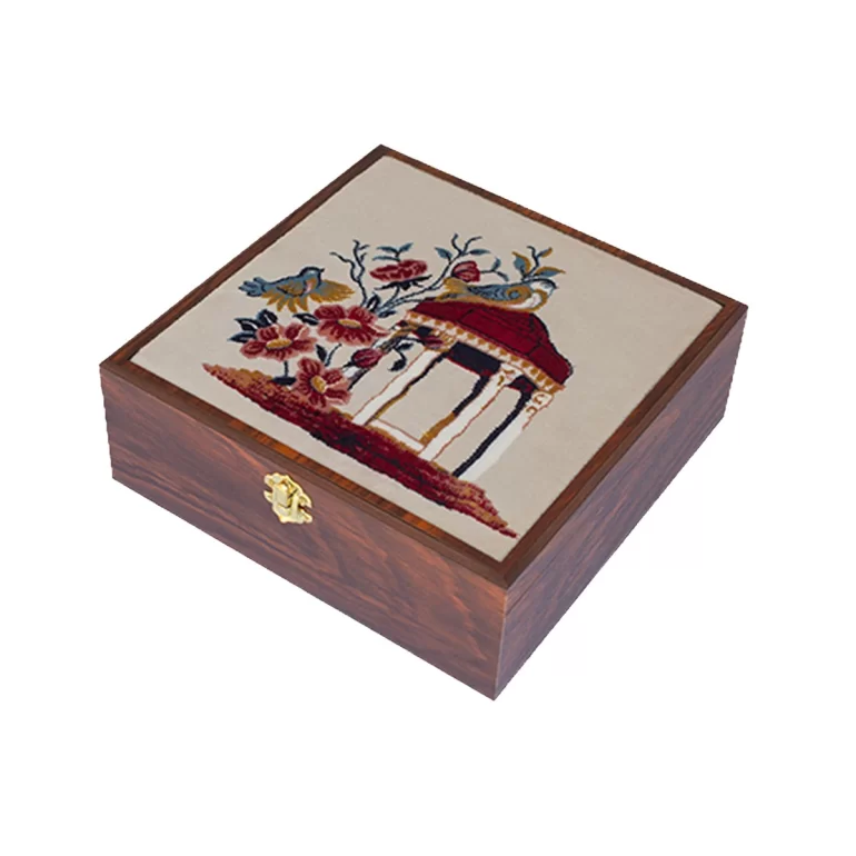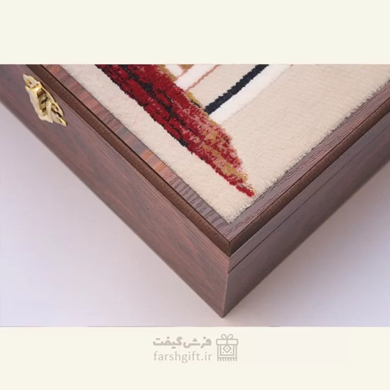 جعبه هدیه از جنس ام دی اف و طرح روی آن از فرش دستبافت با طرح آرامگاه حافظ می باشد.