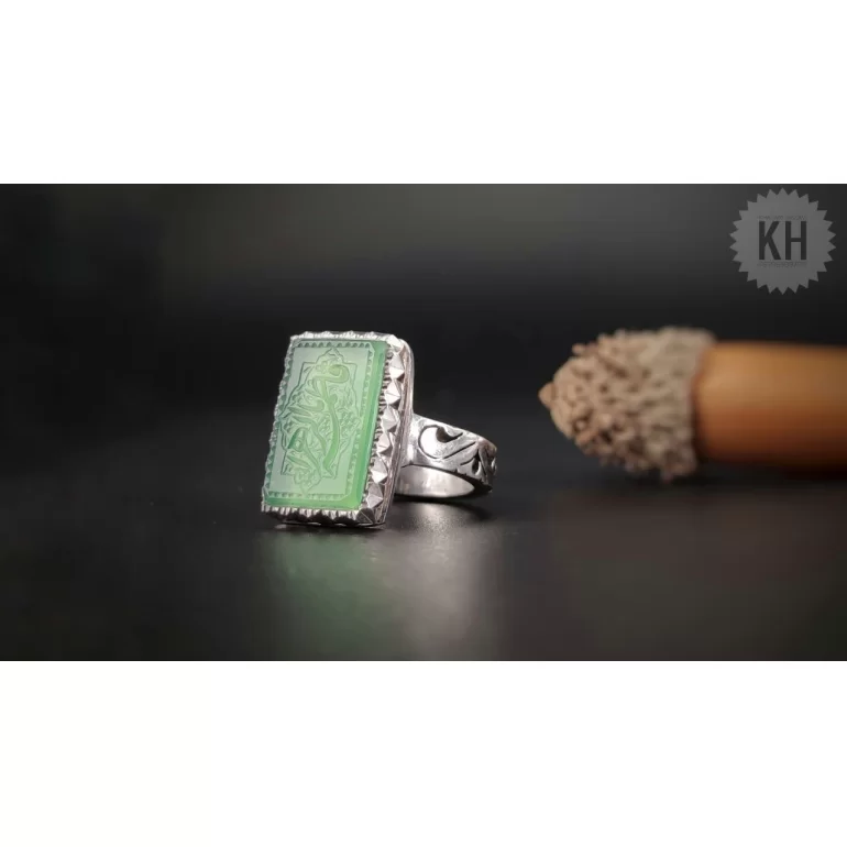 رکاب این انگشتر مردانه تمام دست ساز از نقره 925 عیار بوده و نگین آن از جنس عقیق سبز خراسانی با حکاکی یا فاطمه الزهرا (س) می باشد. وزن این انگشتر نفیس تقریبا 17.88 گرم است و به صورت حرفه ای به دست استاد طه ع ساخته می شود.