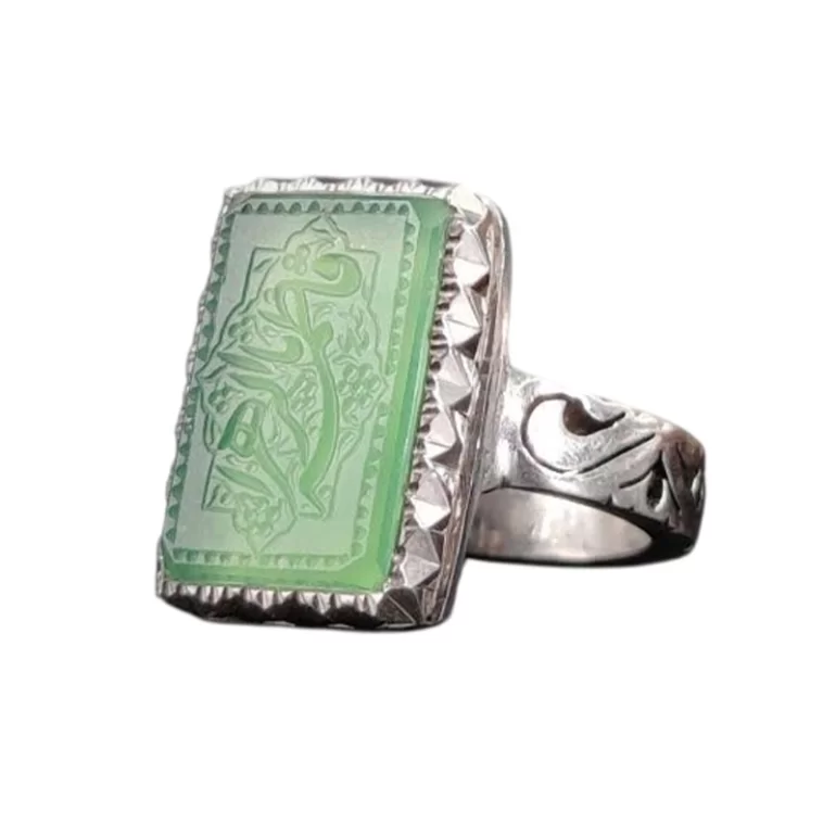 انگشتر نقره مردانه مدل عقیق سبز خراسان با حکاکی یا فاطمه الزهرا