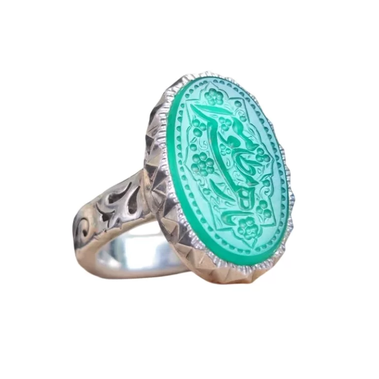 رکاب این انگشتر مردانه تمام دست ساز از نقره 925 عیار بوده و نگین آن از جنس عقیق سبز خراسانی با حکاکی یا زهرا مظلومه (س) می باشد. وزن این انگشتر نفیس تقریبا 15.77 گرم است و به صورت حرفه ای به دست استاد طه ع ساخته می شود.