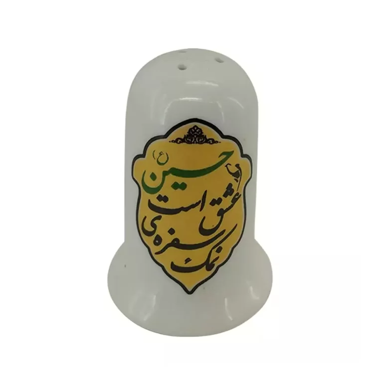نمکدان چینی با طرح «سفره عشق است حسین» مناسب استفاده در منزل و مجالس روضه است. از جنس چینی و قابل شستوشو میباشد. ابعاد 4×4×7 سانتیمتر و وزن تقریبی آن 45 گرم است.