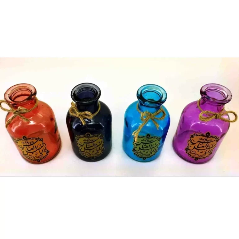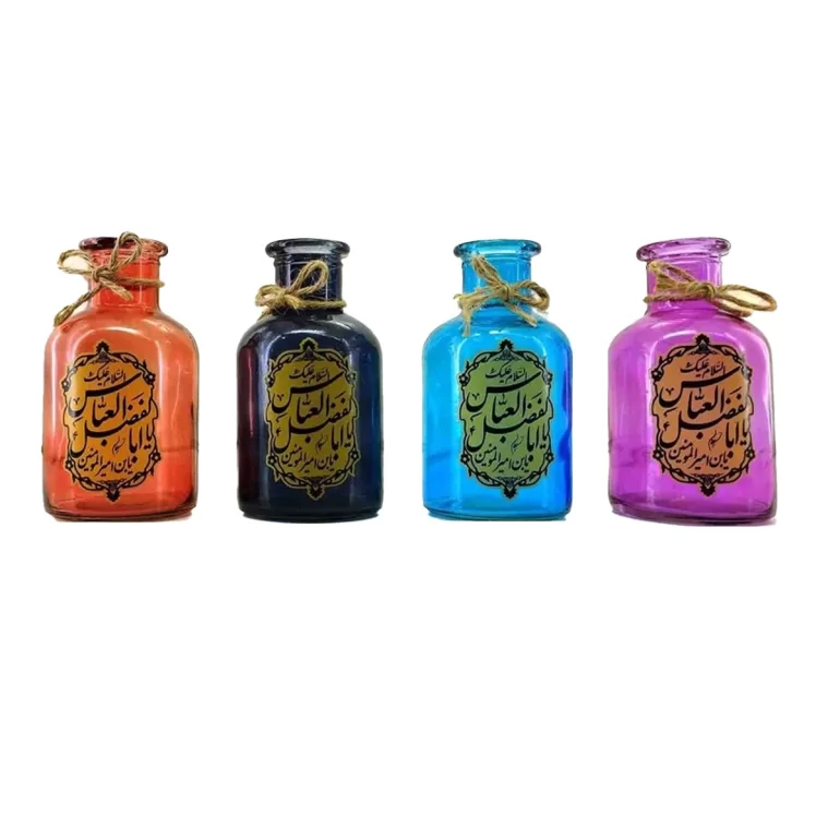 گلدان شیشه‌ ای استوانه ای مذهبی برلیان پایه کوتاه رنگی طرح یا اباالفضل