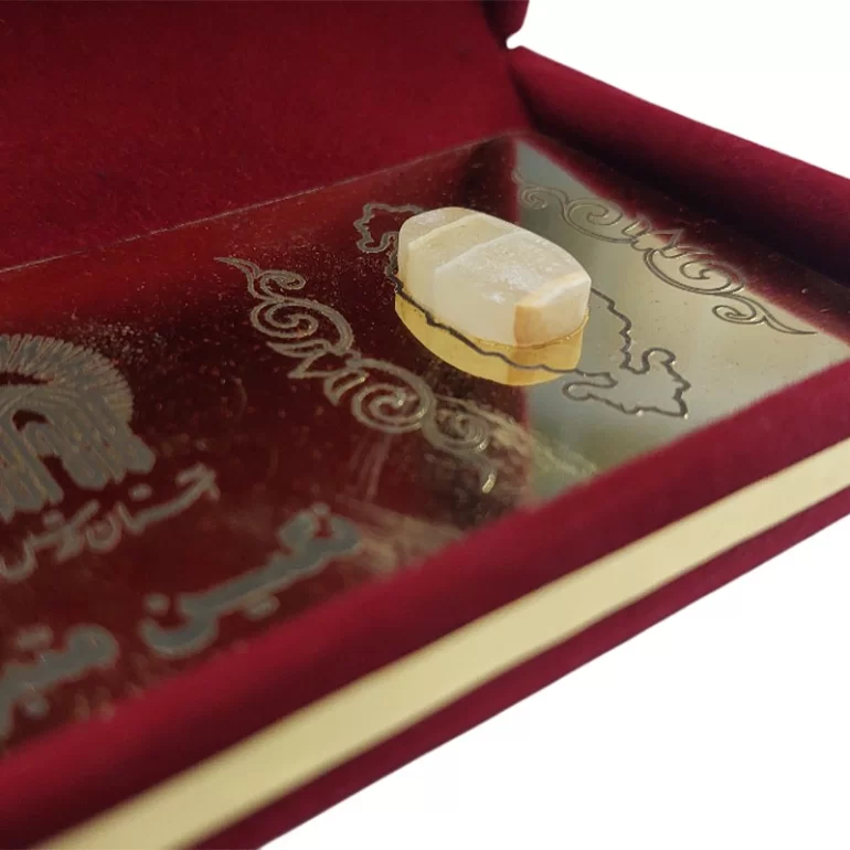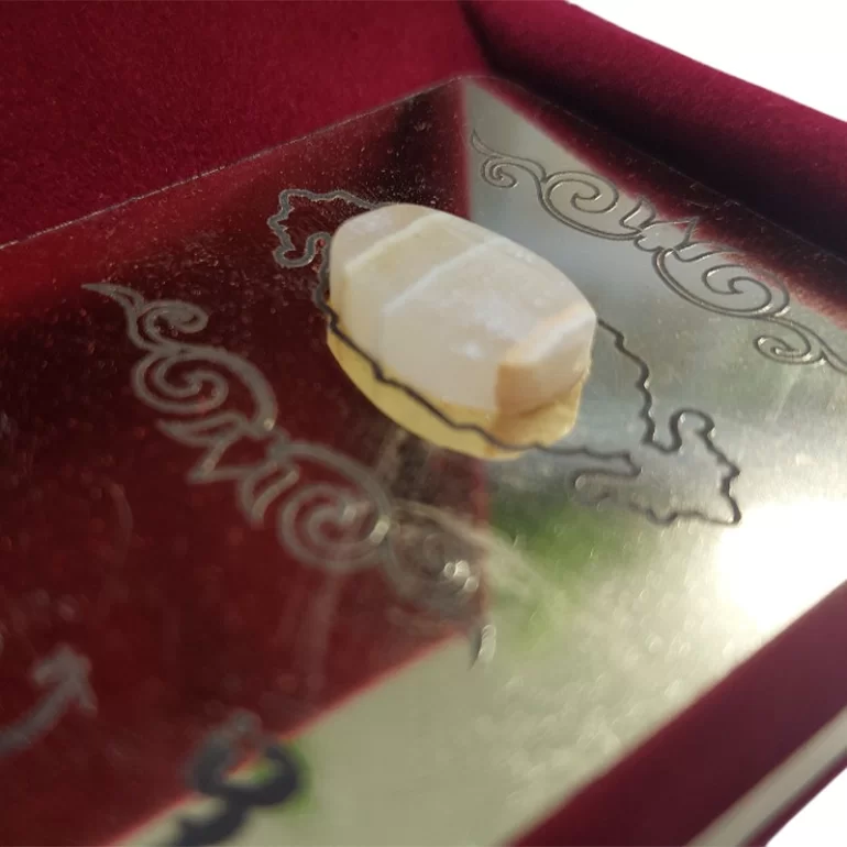 ابعاد تقریبی نگین 17*13 میلی متر به ارتفاع 3 میلی متر. این محصول قطعه ای از سنگ های حرم امام رضا (علیه السلام) می باشد که توسط استادان ماهر به صورت یک نگین زیبا تراش خورده است و در بسته بندی نفیس عرضه می شود.