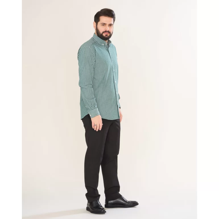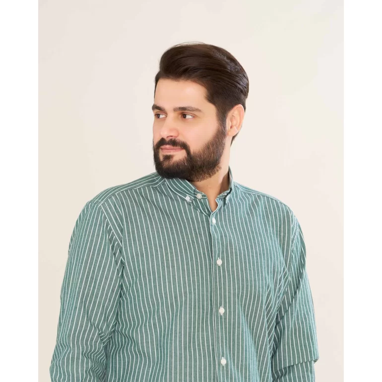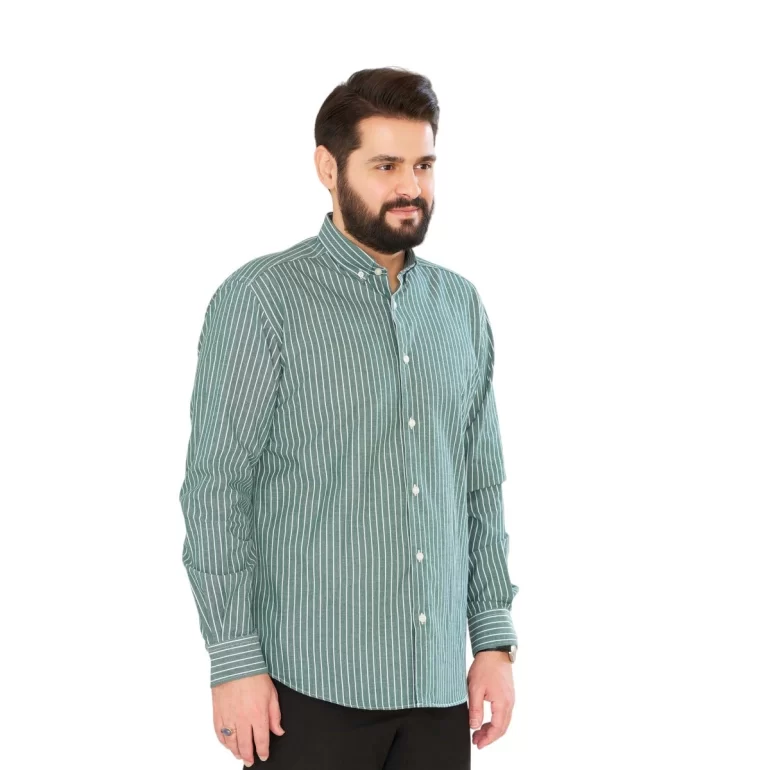پیراهن مردانه اسپرت کد PS21166 با یقه انگلیسی و طرح راه‌راه سفید و سبز، از نخ پنبه‌ای مرغوب دوخته شده است. طراحی تمام‌دکمه و سبک راحت آن، گزینه‌ای ایده‌آل برای استایل روزمره و نیمه‌رسمی به شمار می‌رود.