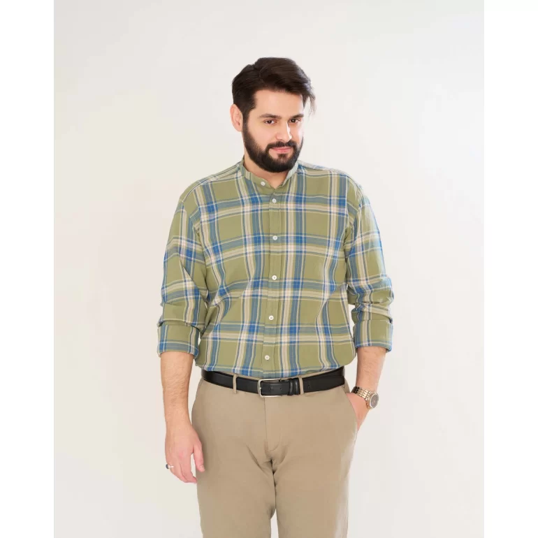 پیراهن پنبه چهارخانه زمینه سبز یقه فرنچ کد PS21162