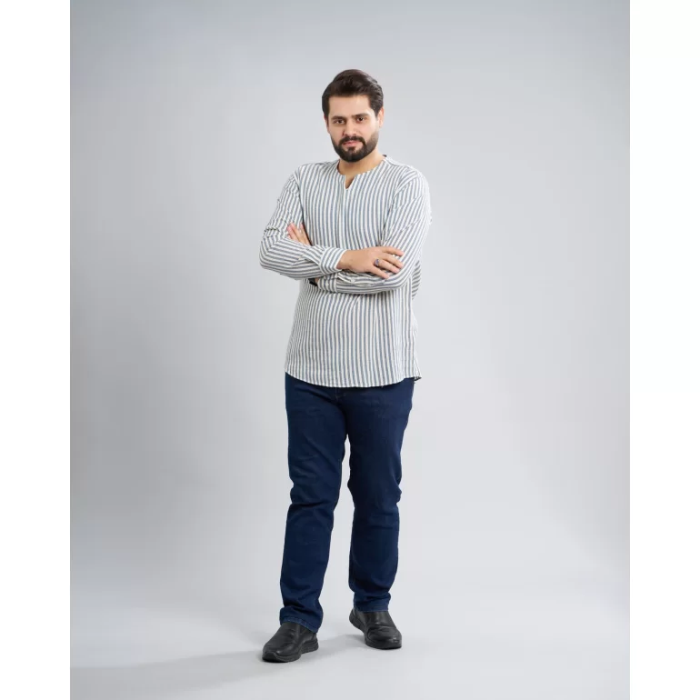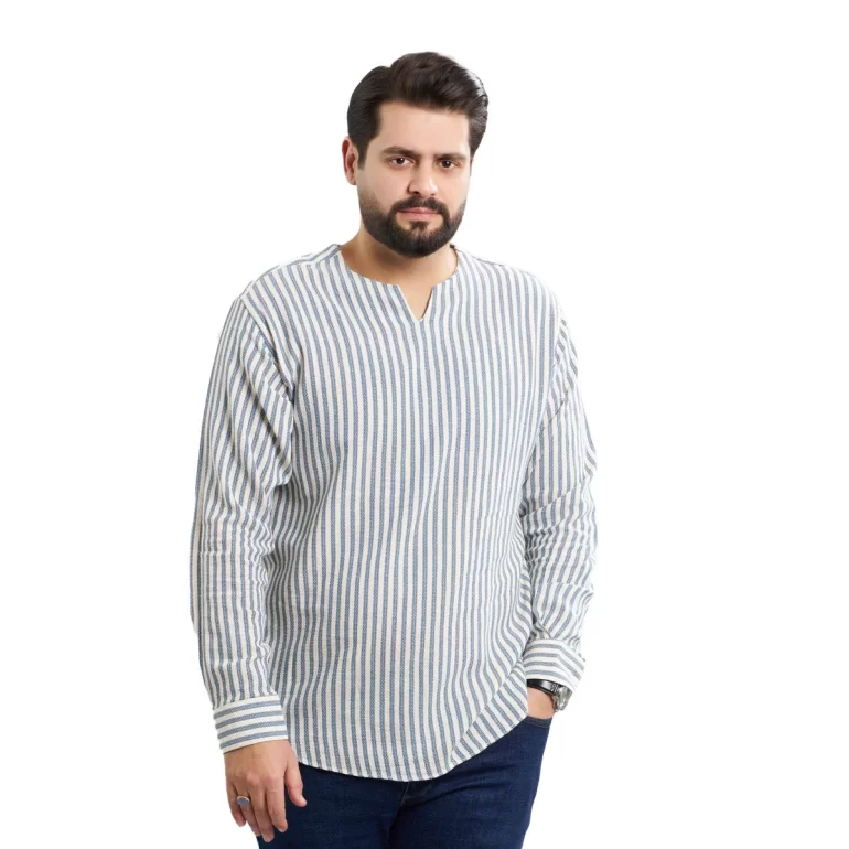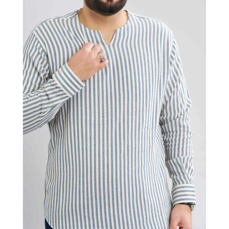 پیراهن عربی بدون یقه مدل رَيّان راه راه زمینه سفید آبی کد PS21125