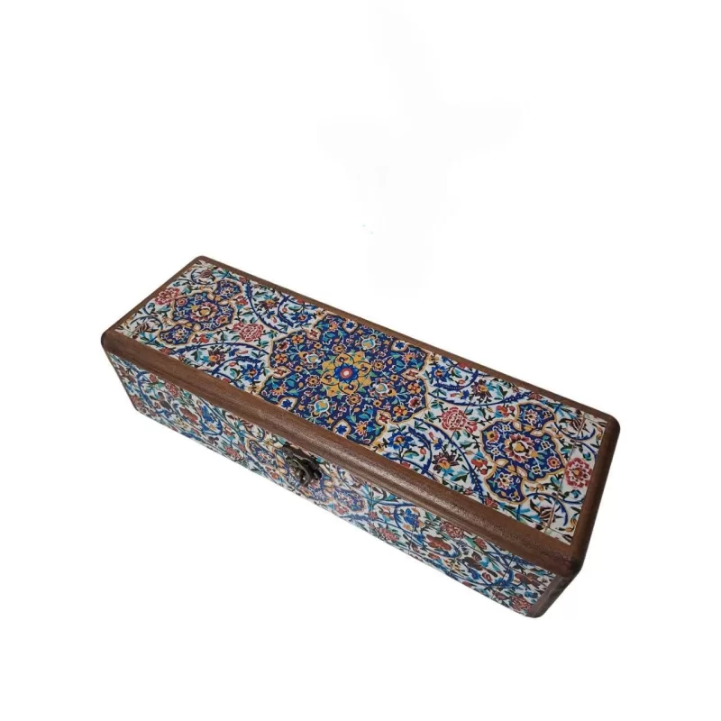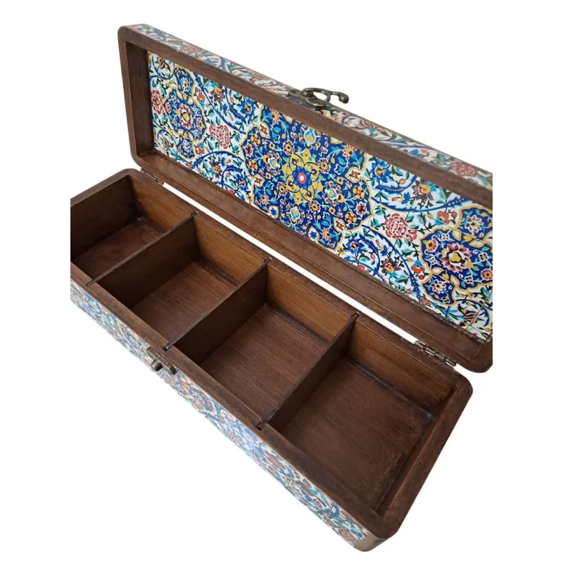 جعبه دمنوش چوبی طرح 110  با ابعاد 10*30 سانتی متر با تکنیک دکوپاژ ساخته شده و ظاهری شیک و اصیل دارد. این محصول علاوه بر نگهداری دمنوش‌ها، گزینه‌ای مناسب برای هدیه و همچنین دکوراسیون منزل یا دفتر کار است. طرح روی جعبه بر اساس کدبندی هنرکده نقشینه (طرح 110) اجرا شده است.