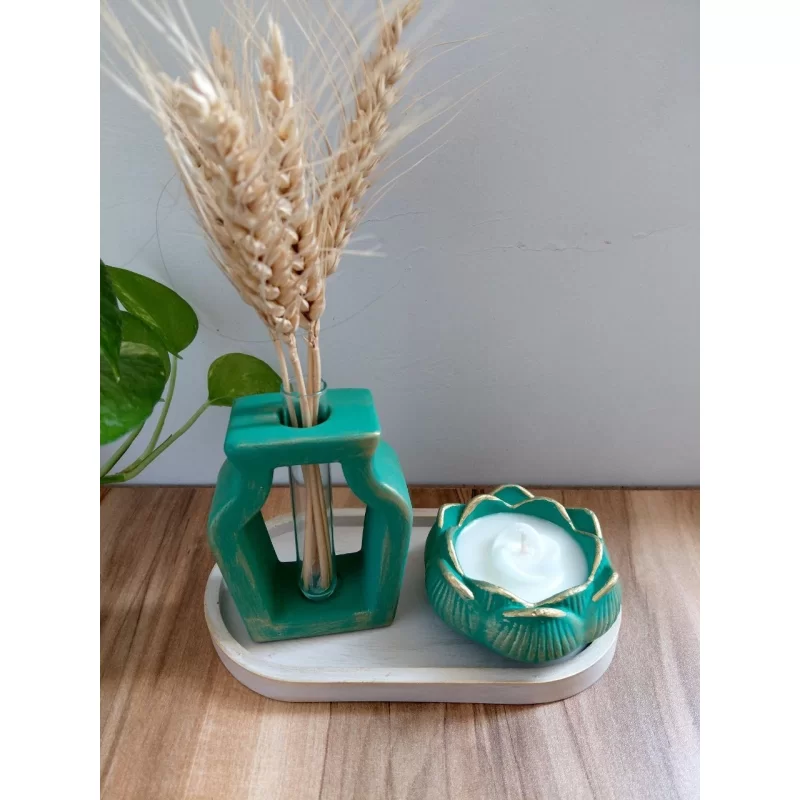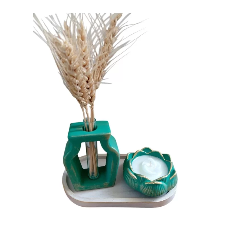 ست سینی گلجا و شمع آلاله از جنس سنگ مصنوعی بوده و قابلیت شستشو دارد. این محصول قابل اجرا در رنگ دلخواه است و ابعاد سینی آن 9×17.5 سانتیمتر میباشد. مناسب برای دکور میز، شلف و فضاهای مدرن یا سنتی.