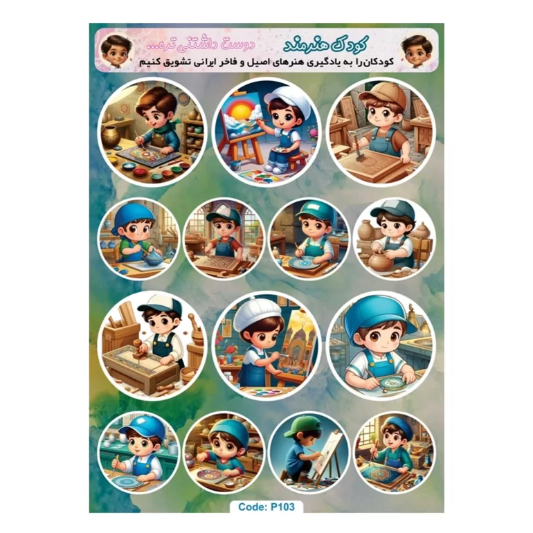 برچسب کودکانه پسرانه کد P103 با طرح کودک هنرمند، دارای طراحی جذاب به سبک ایرانی اسلامی است. این استیکر از جنس PVC براق و باکیفیت ساخته شده و به‌صورت نیم‌تیغ دوربری شده است. ابعاد آن حدود 20×14/5 سانتی‌متر بوده و به‌صورت تک عددی عرضه می‌شود. این برچسب گزینه‌ای مناسب برای تزئین دفتر، کیف، لوازم شخصی و وسایل اتاق کودک است.