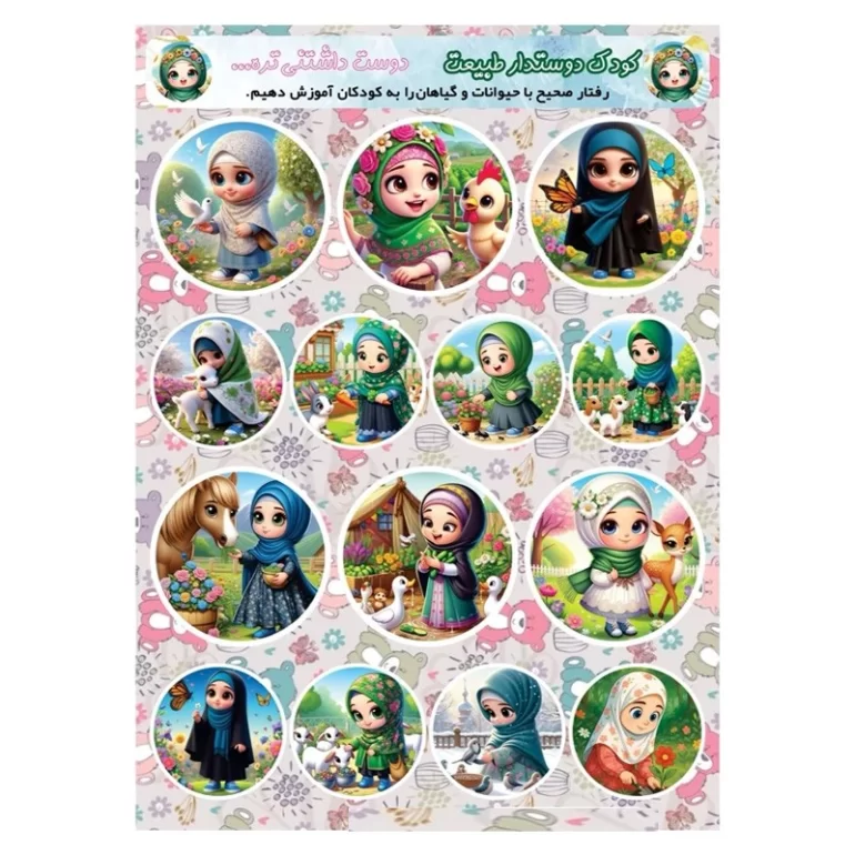 برچسب کودکانه دخترانه «کودک دوستدار طبیعت»، این استیکر با طراحی ایرانی اسلامی و طرحی جذاب و متنوع مناسب برای کودکان دختر و پسر تولید شده است. هر برگ با موضوعی خاص، دوربری شده به صورت نیمتیغ و از جنس PVC براق با ابعاد تقریبی 20×14.5 سانتیمتر است.