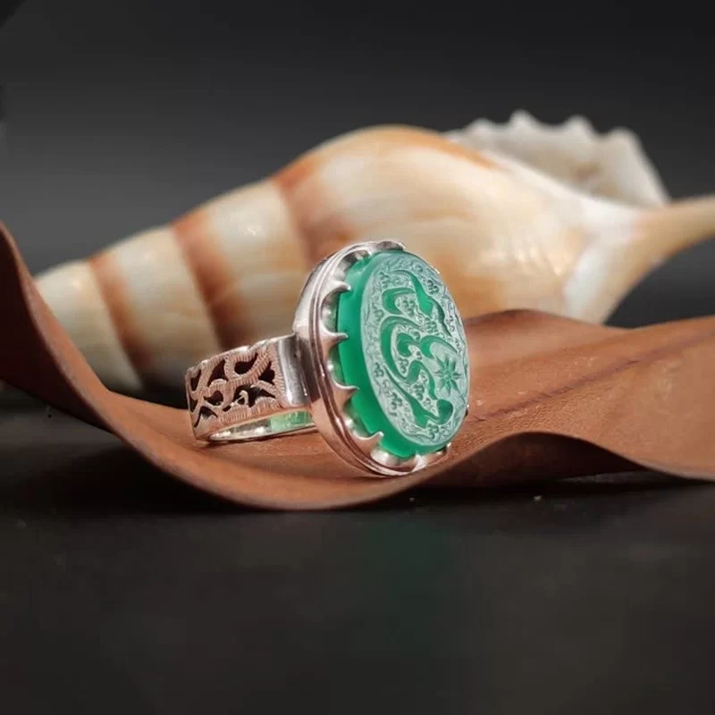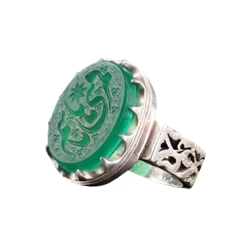 انگشتر نقره مدل عقیق سبز حکاکی یا قمربنی هاشم